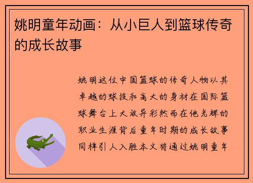 本文围绕“芜湖姚明辰:探索篮球之路与人生哲学的交汇点”这一主题,探讨了姚明辰在篮球运动中的成长历程,以及他如何通过篮球这项运动来反思和实践人生哲学。首先,从姚明辰的个人背景出发,分析其在篮球道路上的启蒙与坚持;其次,探讨他在比赛中所体现的团队精神和领导能力;接着,剖析他对挫折的理解与处理方式,以及这些经历如何塑造了他的性格;最后,总结姚明辰如何将自己的篮球理念与人生哲学相结合,为未来的发展指明方向...