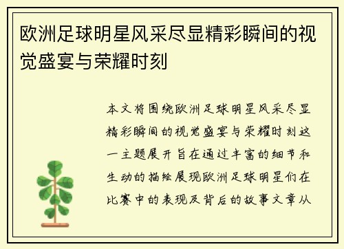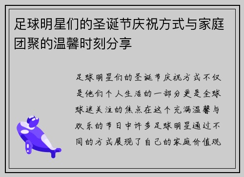 足球,这项全球范围内广受欢迎的运动,吸引了无数人的目光。足球明星们在赛场上的拼搏和奉献不仅展示了他们个人的才能,更为这项运动注入了无限的热情与动力。在这篇文章中,我们将探讨足球明星如何通过无私奉献和拼搏精神,让我们更加热爱这项运动。首先,从他们对训练的坚持与毅力出发,分析这种精神如何激励着年轻一代。接着,讨论足球明星在比赛中的英勇表现所带来的感动与激励。此外,将关注他们在场外的慈善活动与社会责任感...